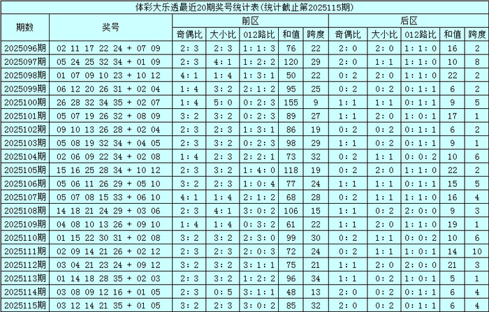 大乐透第2025115期开奖号码为:03、12、14、21、35+01、05。其中前区奖号奇偶比为3:2,大小比为2:3,和值为85,跨度为32,后区奖号奇偶比为2:0,大小比为0:2。