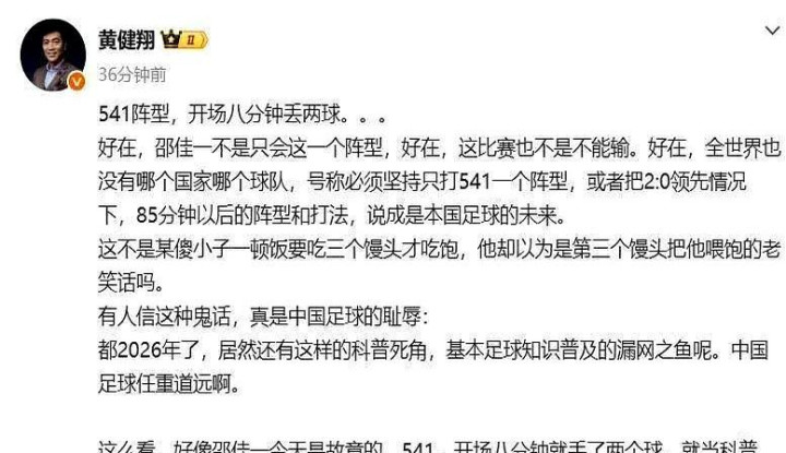 3月31日,国足友谊赛对阵喀麦隆二队,开场9分钟连丢两球,最终0-2落败。临时主帅邵佳一弃用上场赢球的4231,强行变阵541死守,瞬间被打穿防线,引来黄健翔猛烈炮轰,言辞直指保守战术误区,更被解读为影射董路。