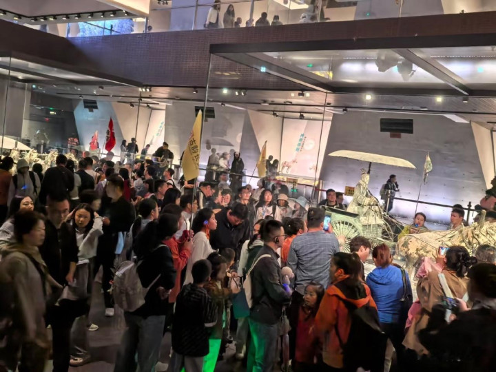 博物馆里的青铜车马前人头攒动,里三层外三层围得水泄不通。