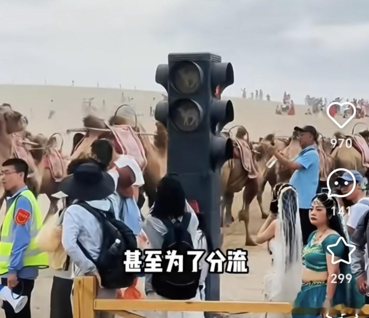 把鸣沙山的骆驼都累得够呛,为了分流甚至沙漠里都装上了红绿灯。