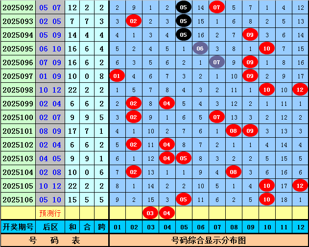 后区分析(一区01-04,二区05-08,三区09-12):上期后区开出奖号05和10,最近10期后区三区落号比为8:11:7,本期后区关注号码03、04、07、08、09,后区两码参考03、04。