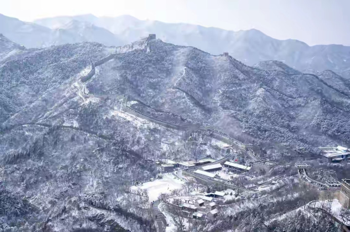 最新的画面简直让人挪不开眼。往远处看,天地之间苍茫一片,原本蜿蜒起伏的山脉现在全被厚厚的积雪盖住了。而在这一片纯白之中,长城就像一条刚刚苏醒的巨龙,披上了一层耀眼的银色铠甲。它顺着山脊一路向上奔腾,气势磅礴得就像是要直接冲进云彩里去。