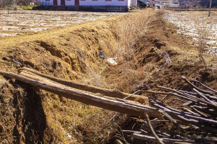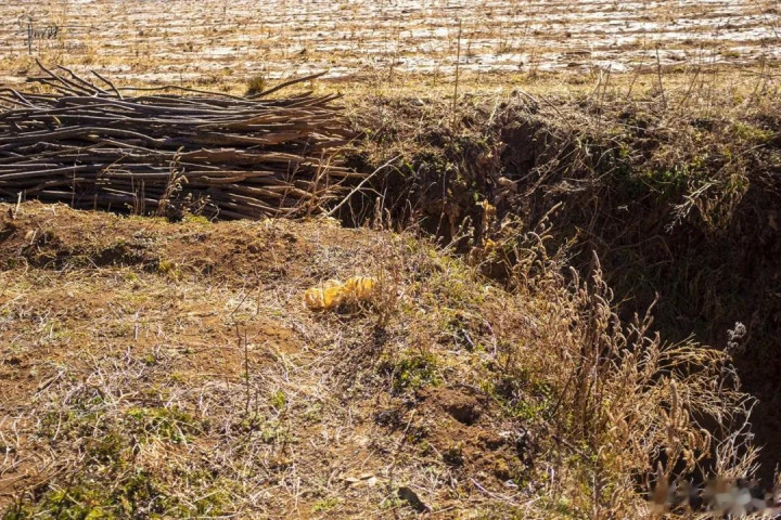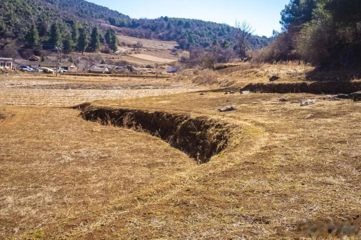由于坑底的泥巴地看不出软硬程度,所以我在这里并没敢跳下去近距离观察,而很快吸引我注意的倒是旁边的沟渠。只见它全长有一公里多,上宽下窄,俨然就跟影视剧战争片里的“战壕”似的,呈“L”形一直通往麻风村,这时已然能推测出来,应该是当地比较古老的“排水渠”,回村后跟养老院的工作人员一问,果然就是这个答案。