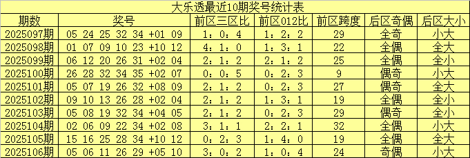大乐透第2025106期奖号开出:05 06 11 26 29 +05 10。其中前区三区比为3:0:2,012路比为1:0:4,后区开出一大一小、一奇一偶奖号。