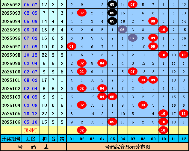 后区分析:上期后区开出号码05和10,最近10期后区奖号奇偶比为6:14,大小比为10:10,本期后区看好号码01、02、06、10、11,后区单挑两码02、10。