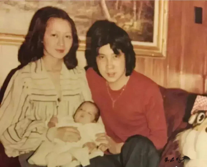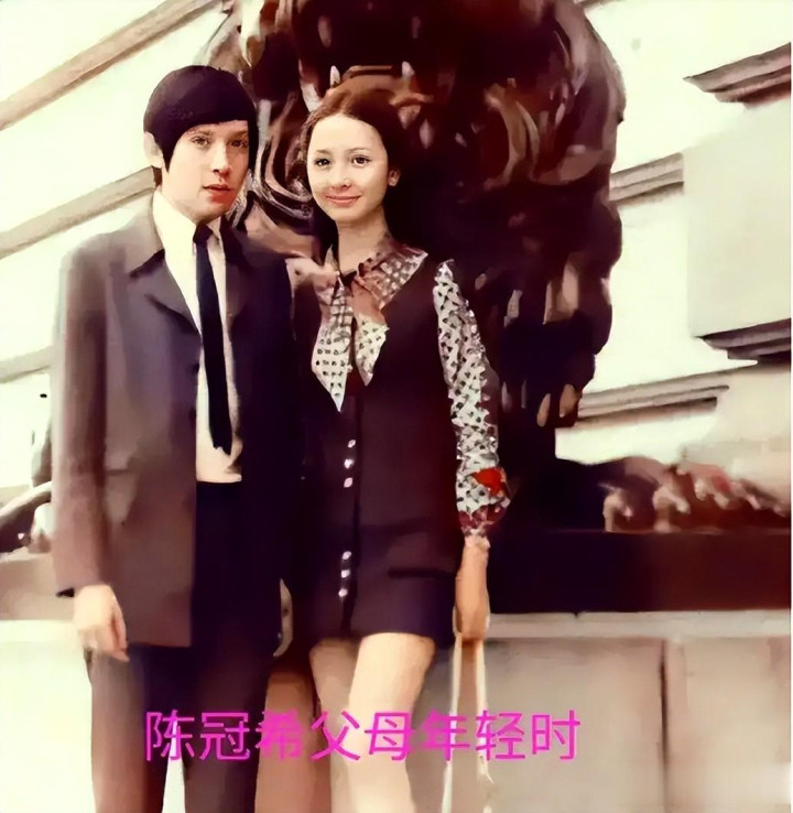 上世纪 70 年代温哥华银行门口的合影中,陈冠希妈妈披着长发,身着波点套装,颈间丝巾点缀,五官明媚大气。