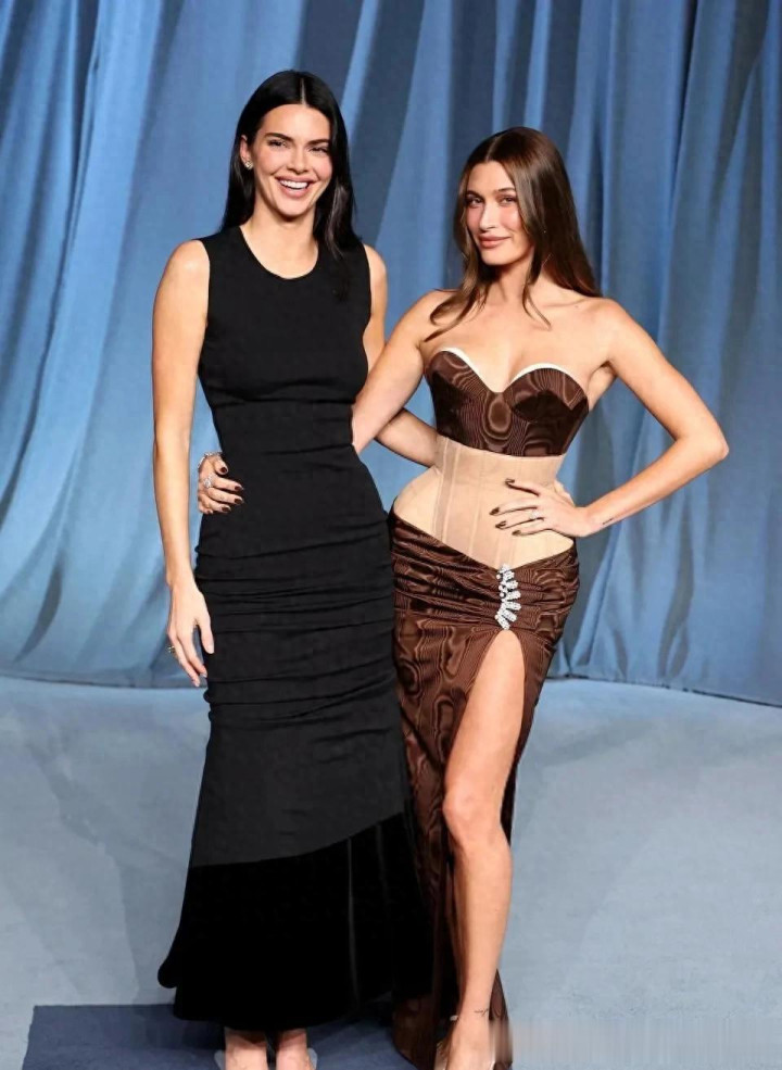 肯豆海莉同框, 两人一人穿黑裙一人穿棕裙, 海莉生娃后小腹平坦